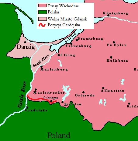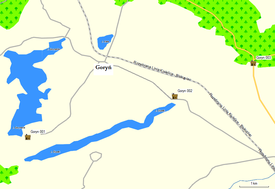 Według polskich źródeł powojennych miała ona długość 50km. Oprócz goryńskich znane są jeszcze trzy takie schrony tego pasa umocnień wybudowane we wsiach Rusinowo i Okrągła łąka. Przedłużeniem Pozycji Gardejskiej na wschód jest Pozycja Iławska. Pozycja Gardejska na mapie Prus Wschodnich Pozycja Gardejska nazywana także Ryglem Gardejskim była to mobilizacyjna pozycja o charakterze ofensywnym zabezpieczająca przed ewentualnymi wypadami przeciwnika (Polski) na te tereny. Wskazuje na to usytuowanie bunkrów tak blisko granicy. Schrony zabezpieczały też koncentrację wojsk do działań przeciwko Polsce (tzw. plan „Fall Weiss”), m.in. mobilizację i natarcie XXI Korpusu (21DP i 228DP) gen. Falkenhorsta w kierunku Grudziądza. Pozycje trzech goryńskich schronów bojowych na aktualnej mapie Obiekty Pozycji Gardejskiej nadzorowali i obsadzali pogranicznicy (Grenzwacht). We wrześniu 1939 roku pododdziały wojsk pogranicznych włączono w skład XXI Korpusu. Zasadnicze siły niemieckie uderzyły z rejonu Biskupiec-Gardeja na wschodnie skrzydło polskich umocnień polowych nad Osą. Między innymi dzięki goryńskim umocnieniom umożliwione zostało szybkie połączenie z siłami nacierającymi z Pomorza i odcięcie polskich sił w rejonie wybrzeża. Obiekty te zabezpieczały też rejon budowanej przeprawy przez Wisłę pod Gniewem (most pontonowy). Za to w 1945 roku umocnienia Pozycji Gardejskiej nie odegrały większej roli ponieważ zdziesiątkowane niemieckie dywizje 2 Armii (XXVII Korpus) starały się za wszelką cenę wycofać za Wisłę i tam zająć obronę. 24 stycznia oddziały 2 Radzieckiej Armii Uderzeniowej zajęły Goryń a wraz z nim goryńskie schrony bojowe. Stanowiska goryńskie wykorzystywały dogodne przeszkody terenowe (lasy, jeziora) i miały za zadanie zablokować ogniem broni maszynowej najważniejsze drogi przecinające granicę. Wsparcie artylerii i działek przeciwpancernych dla tych umocnień przewidywano z otwartych stanowisk polowych które miały być wybudowane dopiero po ogłoszeniu mobilizacji. Plany tych umocnień sporządzono w X wydziale fortyfikacyjnym OKH w latach 1937-1939, a w lecie 1939r schrony zostały wybudowane. Podstawowe zasady rozbudowy zawarto w instrukcji mobilizacyjnej (Armierung. H. Dv. g. 21 vom 3.6.37). Widok z przedpola na schron nr 1 Widok z przedpola na schron nr 3 Widok z przedpola na schron nr 2 (na wprost, niewidoczny z powodu roślinności) Goryńskie bunkry są typowymi stanowiskami broni maszynowej MG-schartenstand D nazywanymi potocznie „Heinrich” od nazwy blachy falistej. Odlane są z rzadko zbrojonego betonu (pręty grubości 12mm). Szalunek stanowiła blacha falista typu "H" (3/5 obwodu koła) przymocowana zaciskami do ceowników, które z kolei zostały zabetonowane w sklepieniu stropu i w podłodze. Blacha falista spełniała jednocześnie osłonę przed osypywaniem się skruszonego betonu w przypadku bezpośredniego trafienia większym pociskiem. Blacha falista w magazynie schronu nr 3 Ściany zewnętrzne mają grubość 60cm, ścianka wewnętrzna 30cm. Zabezpieczało to obsługę ckm przed pociskami działek przeciwpancernych oraz ogniem broni maszynowej i ręcznej. Wszystkie schrony zamaskowano nasypami ziemnymi. Nad strzelnicą znajdował się okap, na który nakładano maskującą darń, a na części ścian, które nie były osłonięte nałożono maskujący tynk o nierównomiernej strukturze. Okap z maskującą darnią :) nad strzelnicą schronu nr 1 Tynk maskujący schron nr 2 Maskowania takie są „znakiem rozpoznawczym” placówki fortyfikacyjnej z Olsztyna, można zatem sądzić że miała ona nadzór nad budową wszystkich obiektów. Wewnątrz znajdował się niewielki przedsionek-magazyn oraz pomieszczenie bojowe osłonięte płytą pancerną (Leichte Stahlschartenplatte) 422P01 o wymiarach 1400x750x30mm i wadze 340kg posiadającą otwory strzelniczy i obserwacyjny wyposażone w zasuwy. Płyta 422P01. Źródło: www.bunkersite.com