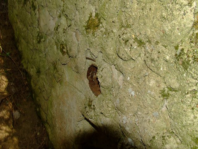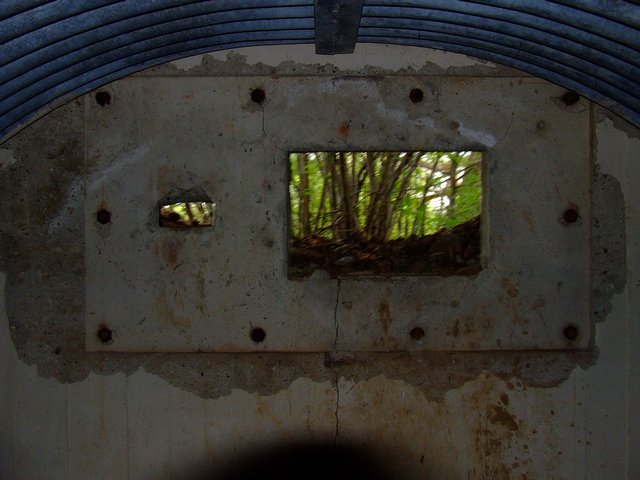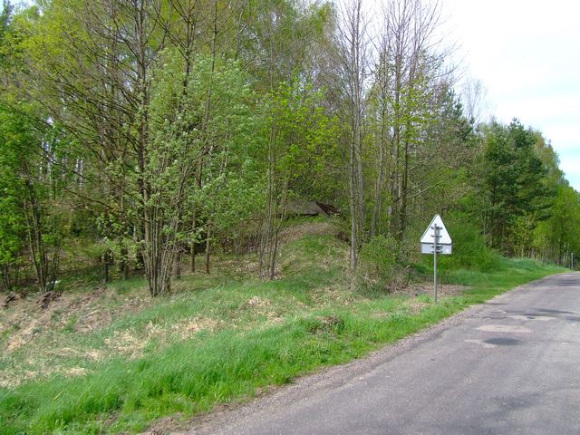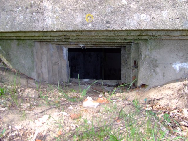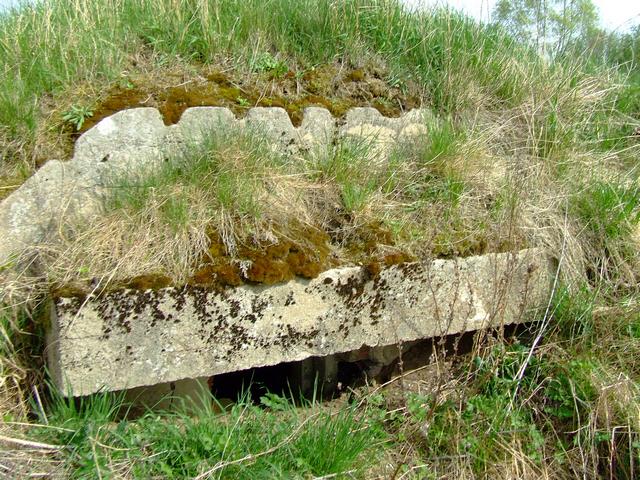 Ślad po płycie 422P01 w schronie nr 2 Pod otworem strzelniczym zabetonowano czop na którym montowano CKM. Każdy schron wyposażony był w piecyk z przewodem kominowym wyprowadzonym przez strop. Strzelnicę oraz szczelinę obserwacyjną osłonięto od zewnątrz betonowym profilem przeciwrykoszetowym. Charakterystyczny schodkowy profil przeciwrykoszetowy schronu nr 3 Kąt ostrzału wynosił 65 stopni. Drzwi wewnętrzne między przedsionkiem, a pomieszczeniem bojowym wykonane były z drewna natomiast drzwi zewnętrzne były dwuczęściowe (osobno otwierało się część górną i dolną), wykonane z grubych desek obitych blachą stalową. Takie dwudzielne drzwi wg. pana Bogusława Wołoszańskiego były podobno polskim doskonałym wynalazkiem. Wejście przed zasypaniem osłaniały niewielkie orylony. Załogę stanowiło 3 żołnierzy: Dowódca-obserwator, taśmowy (instalował taśmę do karabinu i wymieniał skrzynie z amunicją) oraz celowniczy. Uzbrojenie stanowił Ciężki Karabin Maszynowy MG08. Był on zespołową bronią samoczynną, o zasadzie działania opartej o krótki odrzut lufy, mechanizm spustowy umożliwiał tylko ogień ciągły, zasilanie nabojami Mauser kaliber 7,92mm w taśmie parcianej, lufa chłodzona wodą (3 litry), masa całkowita 55,9Kg, zasięg skuteczny ok. 1200m. Film przedstawiający strzelanie z MG08 Była to jedna z głównych konstrukcji Hirama Maxima. Większość tych ckm-ów była produkowana w rządowych zakładach w Królewskiej Fabryce Karabinów w Spandau, stąd broń ta nazywana była także potocznie wśród żołnierzy "Spandau"). MG08 był podstawowym ciężkim karabinem maszynowym armii niemieckiej podczas pierwszej wojny światowej. W 1942 został wycofany z jednostek frontowych, jednakże do końca drugiej wojny światowej był używany w różnych fortyfikacjach. |